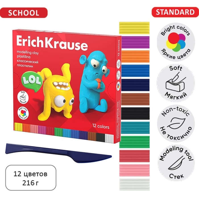 Классический пластилин ErichKrause - серия, созданная специально для детей школьного возраста 7-12 лет. Обновленная формула пластилина с улучшенной мягкостью не крошится и не рвется при разминании, не липнет к рукам и не оставляет жирных пятен. Готовая поделка хорошо сохраняет свою форму и не застывает на воздухе.