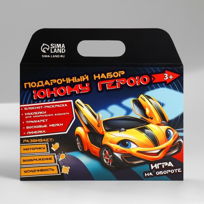 Подарочный набор блокнот-раскраска, трафарет, наклейки и восковые мелки "Юному герою"