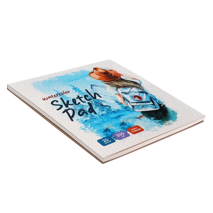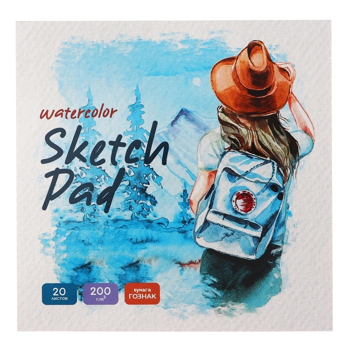 Скетчбук для акварели 200 х 200 мм, 20 листов на склейке "Путешествие", твёрдая обложка, средняя зернистость, блок 200 г/м2, ГОЗНАК