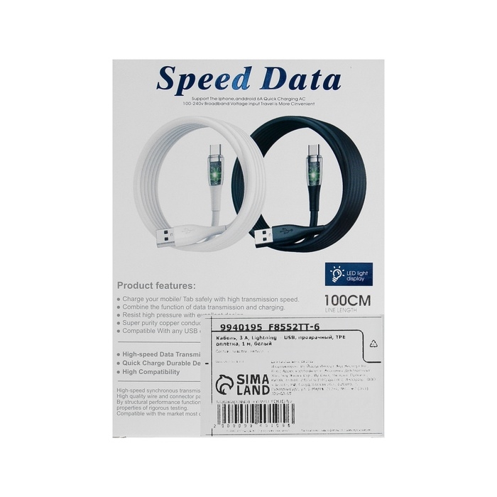 Кабель, 3 А, Lightning - USB, прозрачный, TPE оплётка, 1 м, белый