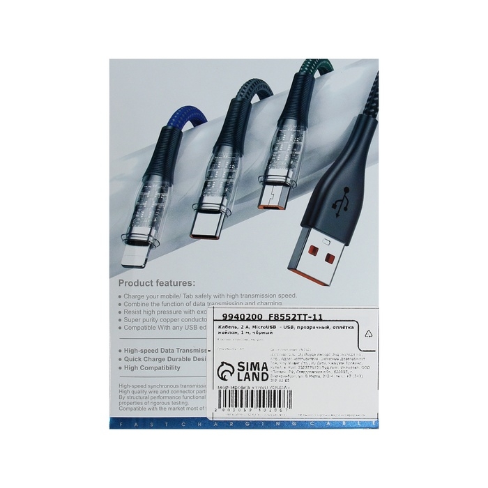 Кабель, 2 А, MicroUSB - USB, прозрачный, оплётка нейлон, 1 м, чёрный