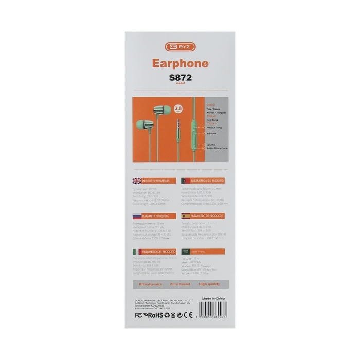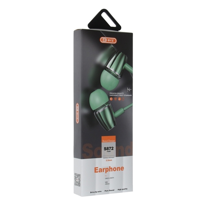 Наушники BYZ S872, проводные, вакуумные, 3.5 мм, 1.2 м, зелёные