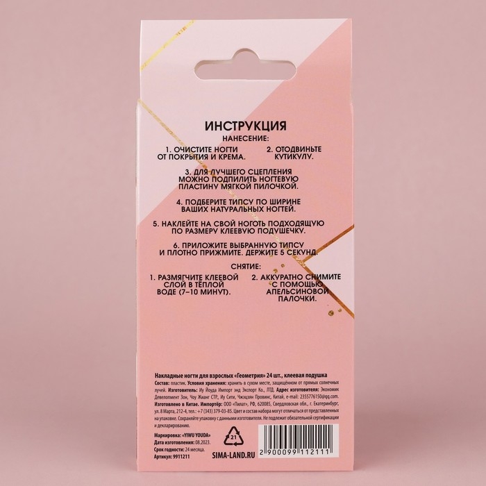 Накладные ногти держатся до двух недель в зависимости от способа крепления и интенсивности воздействия на ногти в процессе носки. Можно использовать клей для накладных ногтей (приобретается отдельно) – это увеличит срок носки. При бережном ношении ногти можно использовать несколько раз.