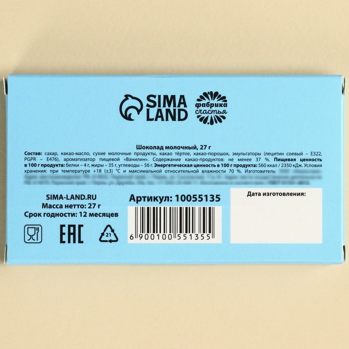 Состав: сахар, какао масло, сухие молочные продукты, какао тёртое, какао-порошок, эмульгаторы (лецитин соевый - Е322, PGPR - Е476), ароматизатор пищевой "Ванилин".
