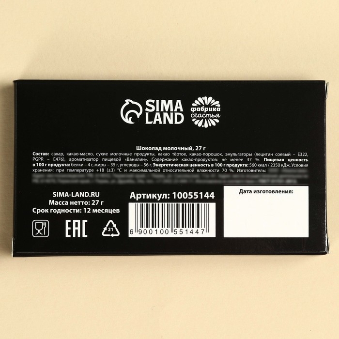 Состав: сахар, какао масло, сухие молочные продукты, какао тёртое, какао-порошок, эмульгаторы (лецитин соевый - Е322, PGPR - Е476), ароматизатор пищевой "Ванилин".