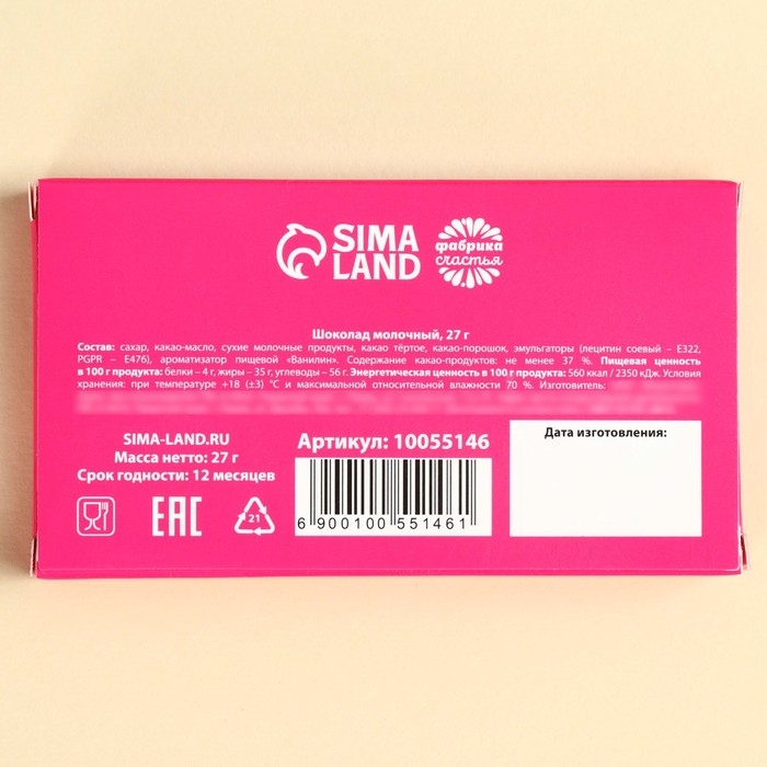 Состав: сахар, какао масло, сухие молочные продукты, какао тёртое, какао-порошок, эмульгаторы (лецитин соевый - Е322, PGPR - Е476), ароматизатор пищевой "Ванилин".
