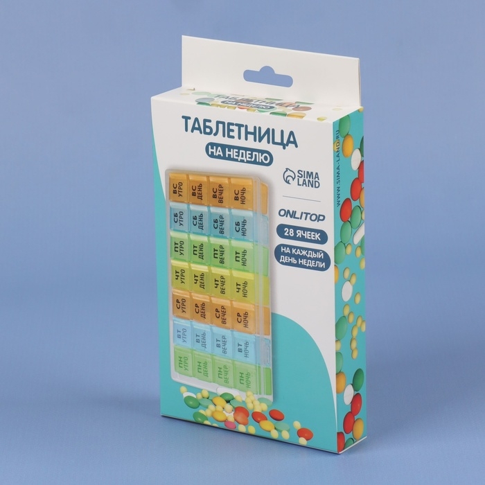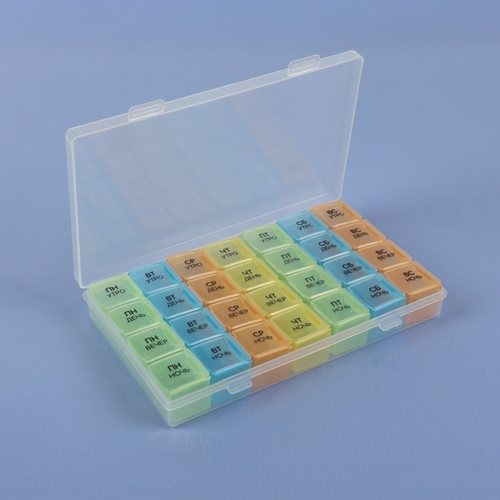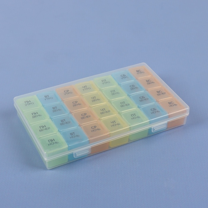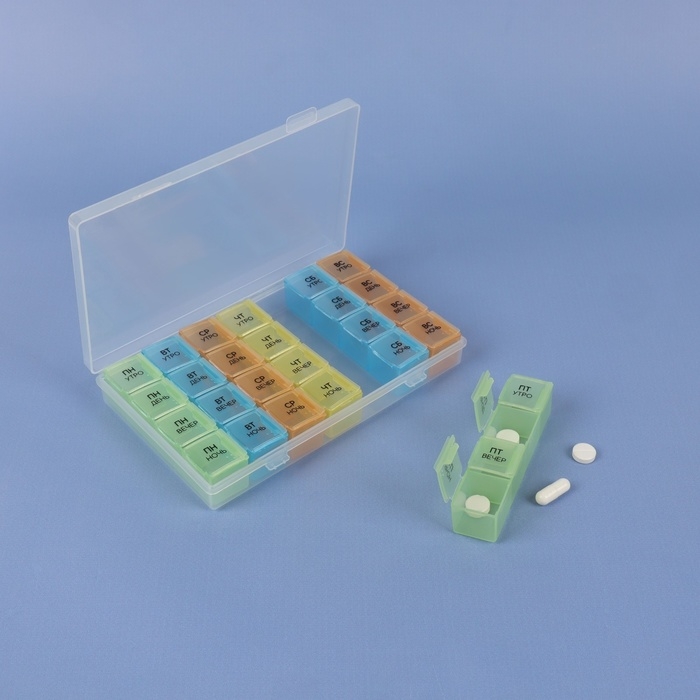 Теперь Вы не забудете принять витамины или таблетки в течение дня: удобная и функциональная таблетница поможет распределить приём нужных препаратов по дням недели и вовремя вспомнить о них.