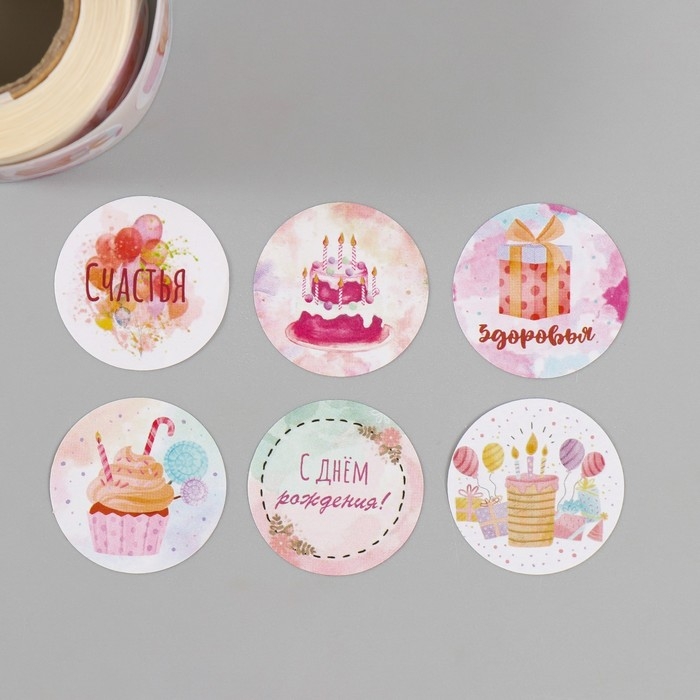 Наклейка бумага "День рождения" d=2,5 см 252 шт в рулоне