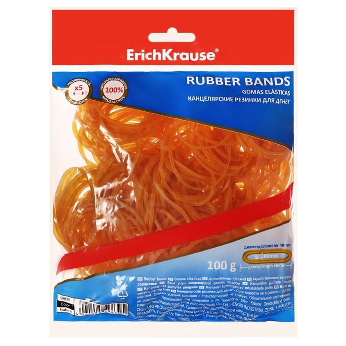 Банковская резинка, 100 г, ErichKrause, диаметр 40 мм, длина 60 мм, 100% каучук, пакет с европодвесом, натуральный цвет