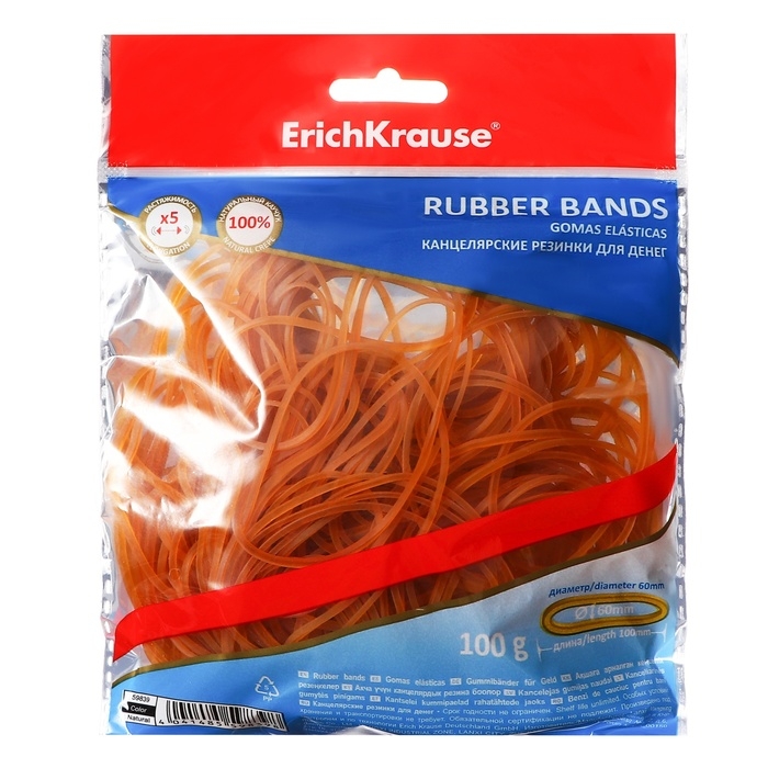 Банковская резинка, 100 г, ErichKrause, диаметр 60 мм, длина 100 мм, 100% каучук, ZIP-пакет с европодвесом, натуральный цвет