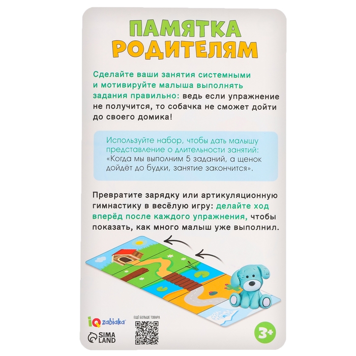 Сделайте ваши занятия регулярными. Используйте набор, чтобы дать малышу представления о длительности занятий: «Когда мы выполним 5 заданий, а щенок дойдёт до будки, занятие закончится».