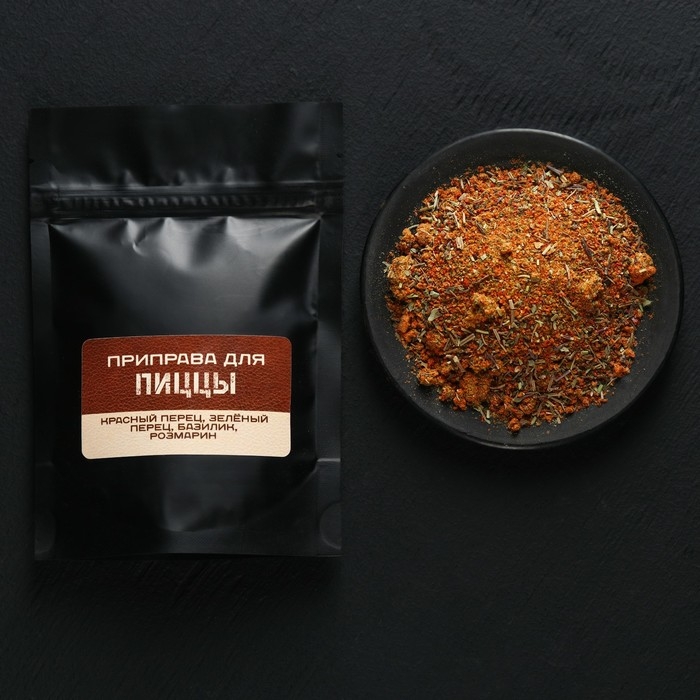 Состав: чеснок, кориандр, орегано, перец красный сладкий (паприка), кумин, перец чёрный, лавровый лист, перец красный острый, корица, томаты, тмин, тимьян, базилик, усилитель вкуса и аромата – глутамат натрия. Смесь для пиццы