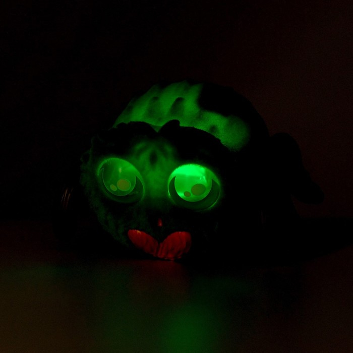 У питомца светятся глазки и шевелятся лапки. Игрушка реагирует на звук. Чем громче ребёнок кричит или хлопает в ладоши, тем быстрее паучок от него убегает.