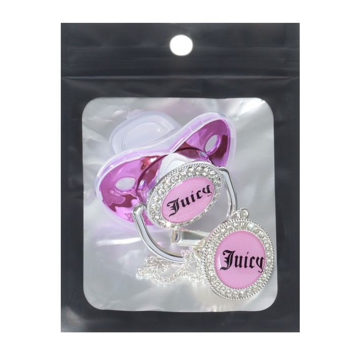 Соска - пустышка силиконовая ортодонтическая «JUICY», от 6 мес., с колпачком + держатель - цепочка, цвет розовый/серебло, стразы