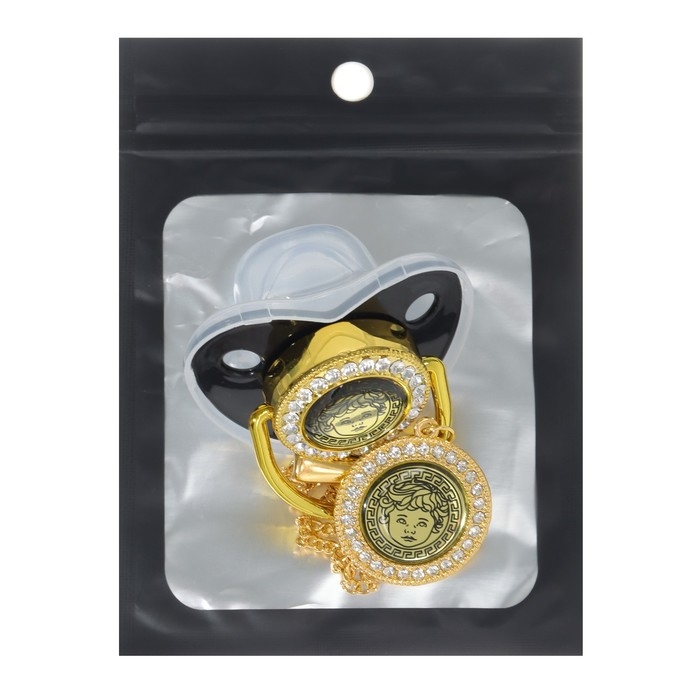 Соска - пустышка силиконовая ортодонтическая «Наш ангел», от 6 мес., с колпачком + держатель - цепочка, цвет черный/золото, стразы
