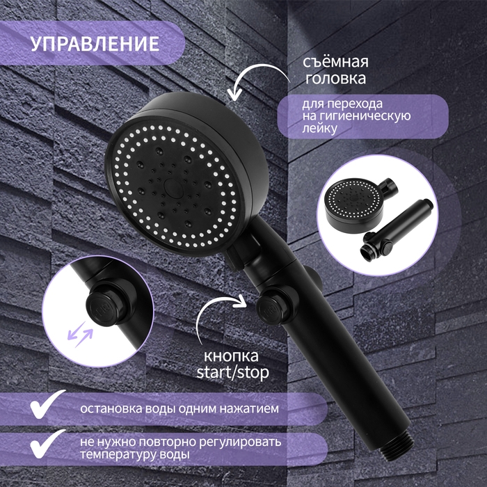 Лейка для душа ZEIN Z3539, d=90 мм, 5 режимов, кнопка "стоп", съёмный верх, черная