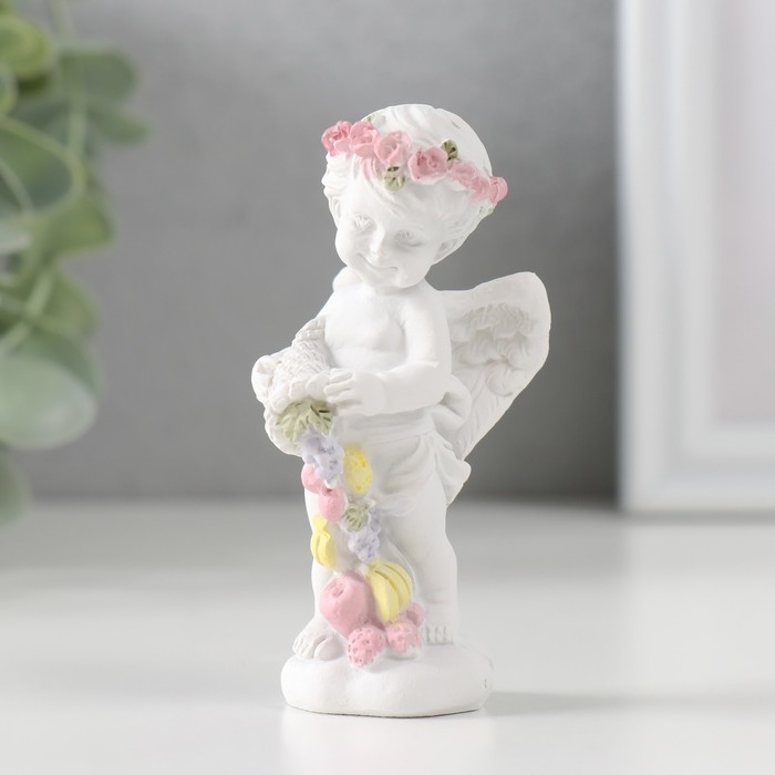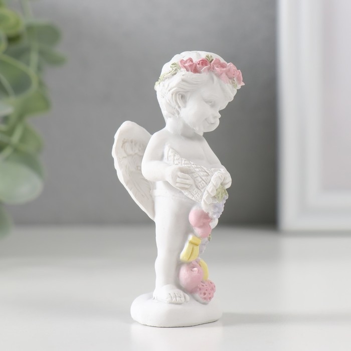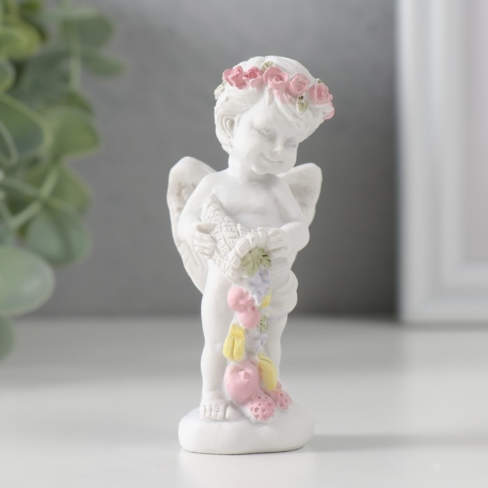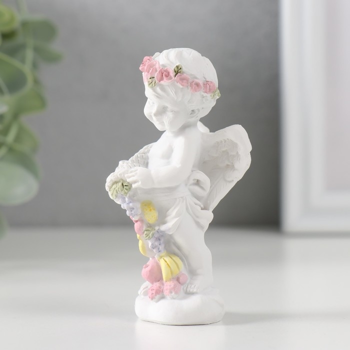 Сувенир полистоун "Белоснежный ангел в венке из роз с рогом изобилия" 8х3,5х4 см