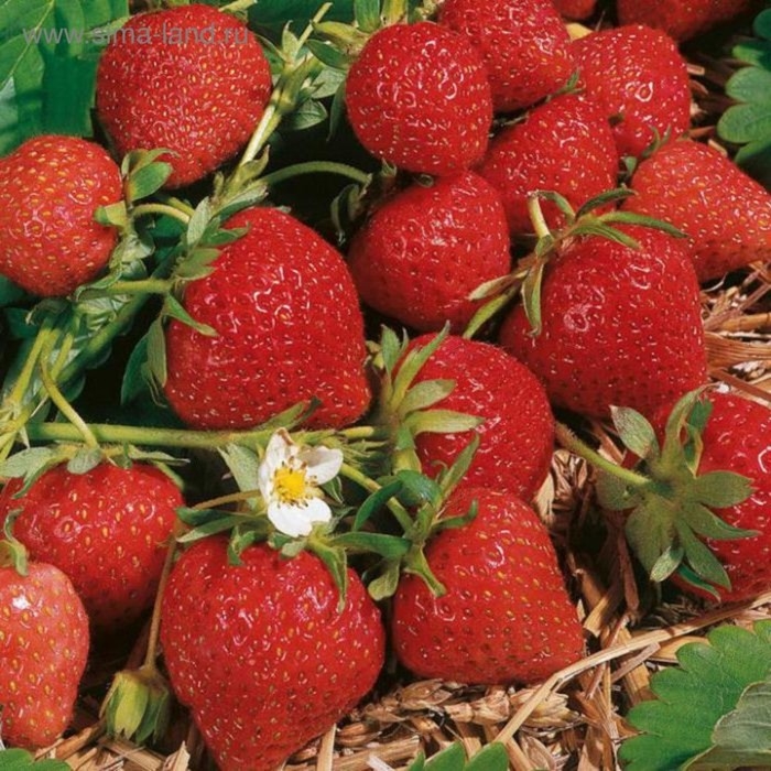 Саженцы с открытой корневой системой. Кусты высокие (25-35 см), раскидистые, до 50 см в диаметре. Листья крупные, ярко-зеленые.Соцветия расположены на мощных цветоносах, над кустом не приподнимаются.Уже в первый год вегетации появляется 1-2 цветоноса, в дальнейшем их количество увеличивается до 4-6 шт. Ягоды интенсивно-алого цвета, глянцевые, формы: «широкий конус», примерно одинаковые по размеру. Вкус сладкий, практически без кислинки, аромат характерный, насыщенный.Масса ягоды: в созревшем виде около 30 г. Сбор: до 1 кг с куста со второго года вегетации.