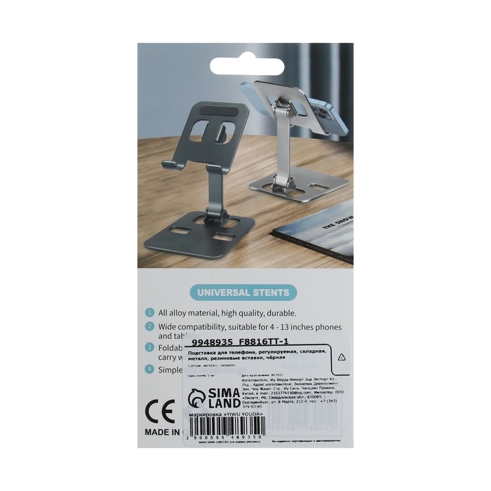 Подставка для телефона, регулируемая, складная, металл, резиновые вставки, чёрная