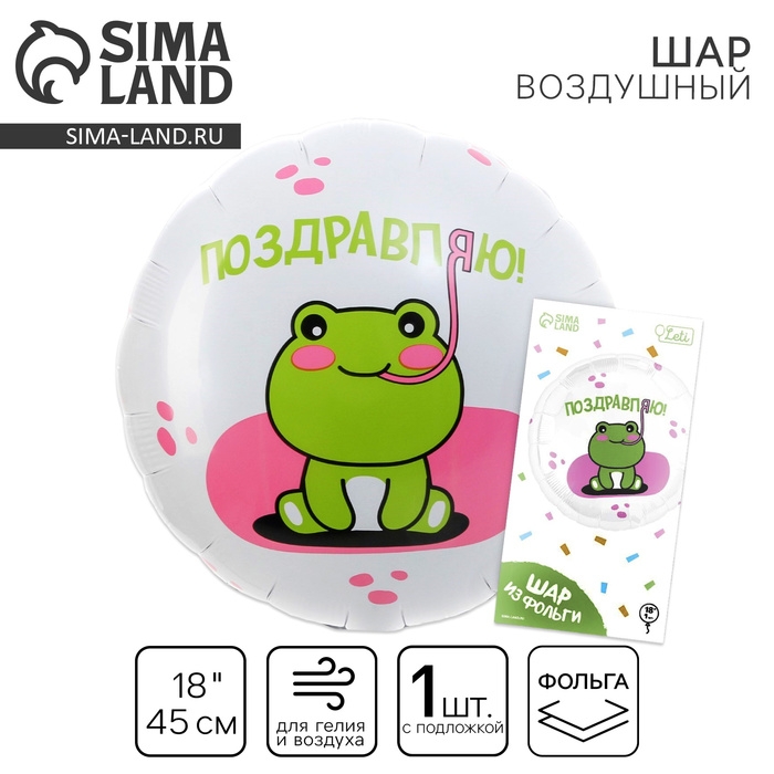 Фольгированный шар с надписью: «Поздравляю!» и принтом с лягушкой — дополнение, которое подойдёт к любому подарку для ребёнка! Вы можете взять несколько шаров и соорудить из них арку или гирлянду. Воздушные шары — простой и удобный способ оформить помещение для мероприятия.