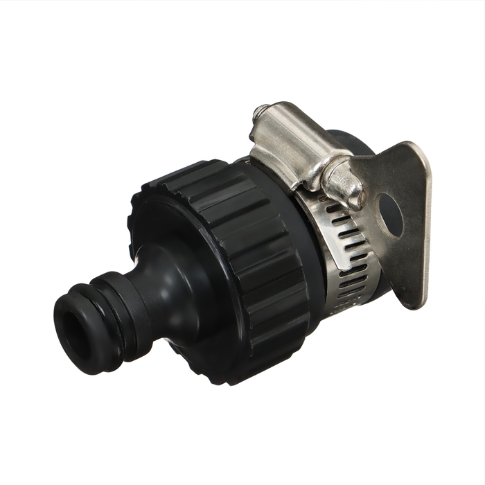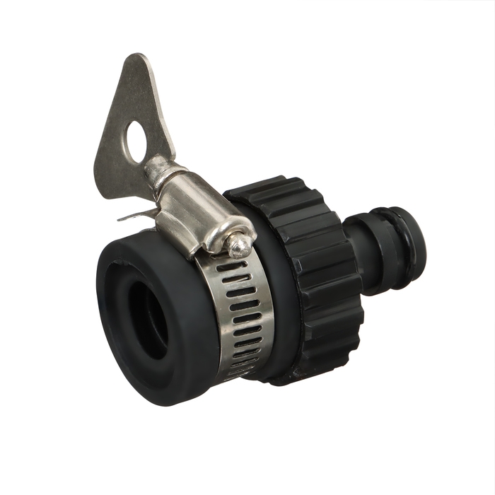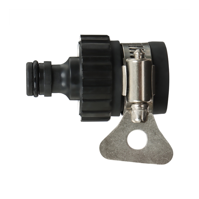 Штуцер безрезьбовой с креплением на кран, 1/2" (12 мм) - 3/4" (19 мм) - 1" (25 мм), с хомутом, быстросъёмное соединение, пластик, резина, Greengo