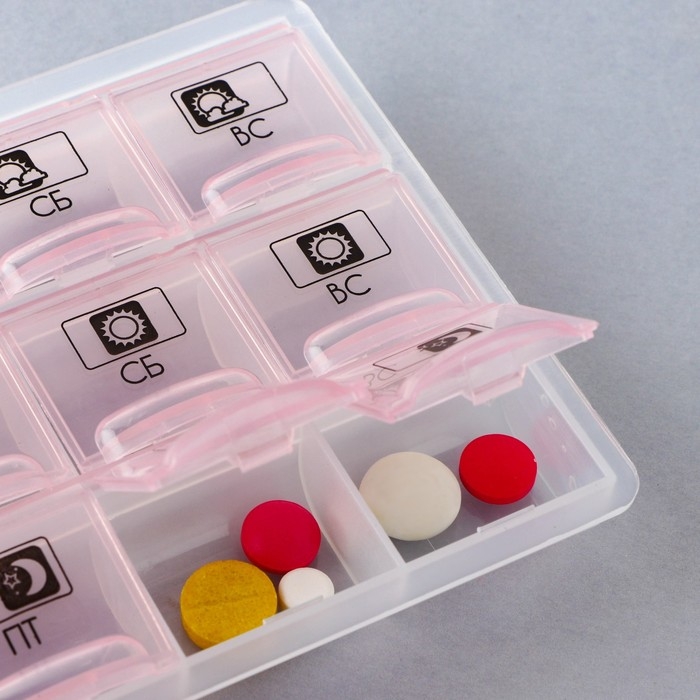 Компактный органайзер изготовлен из пластика безопасного для использования. Предназначен для хранения витаминов и таблеток.Контейнер для таблеток на день послужит компактной аптечкой, которую можно взять на работу,в отпуск,в командировку или для поездки загород на несколько дней. Контейнер органайзер для таблеток подойдет активным людям, которым необходимо принимать лекарства несколько раз в день или же несколько дней подряд вне дома.