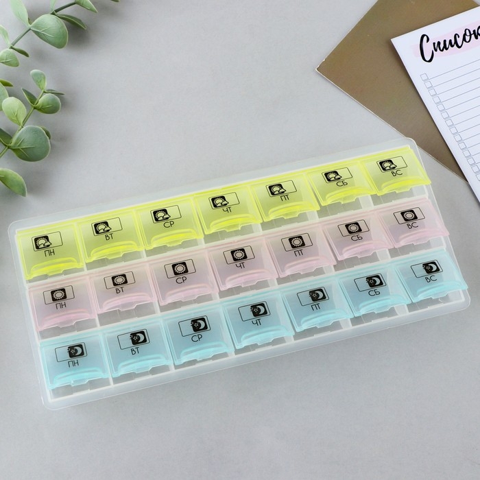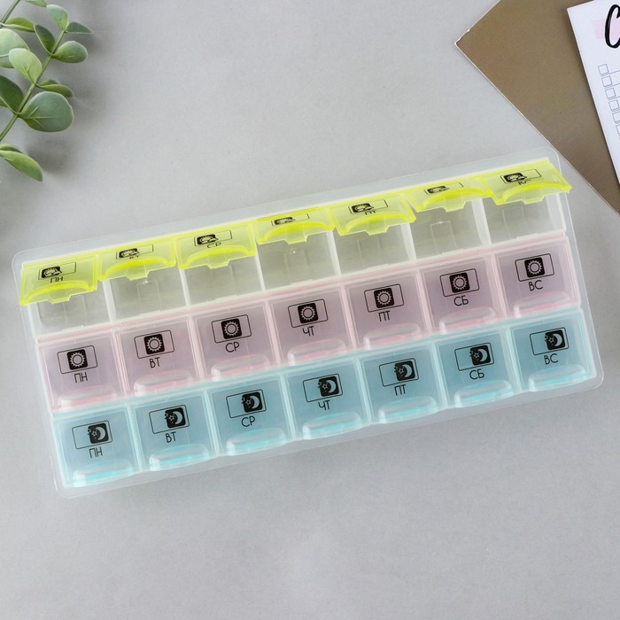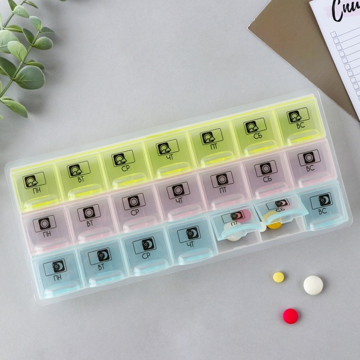 Таблетница - органайзер «Неделька», английские буквы, утро/день/ночь, 21,5 × 11 × 2 см, 21 секция, разноцветная