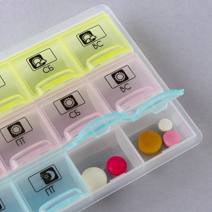Таблетница органайзер «Утро, день, вечер», 21 секция, русские буквы, разноцветная.