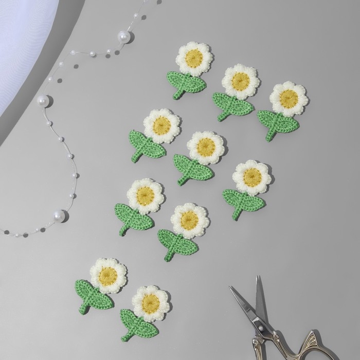 Вязаные элементы «Цветочки», 2,5 × 3,5 см, 10 шт, цвет кремовый/зелёный
