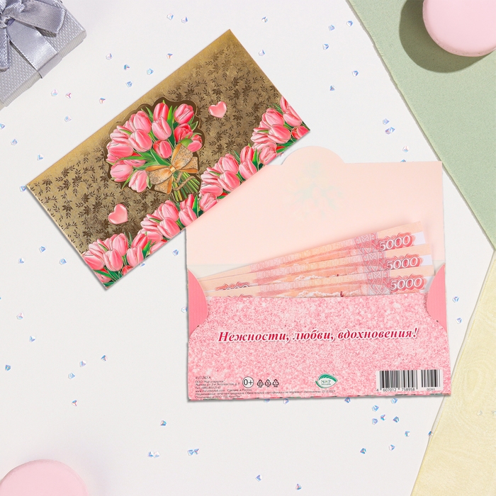 Конвер для денег "Нежности, любви, вдохновения!" тиснение, букет тюльпанов, 16,5х8,5 см