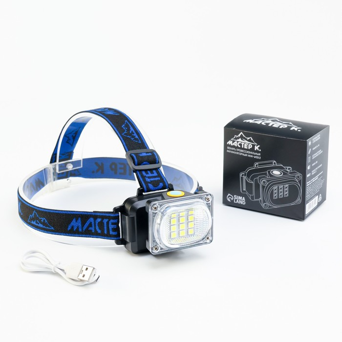 Фонарь налобный аккумуляторный "Мастер К", 4 LED, 2 COB, 2 аккумуляторных батареи, USB
