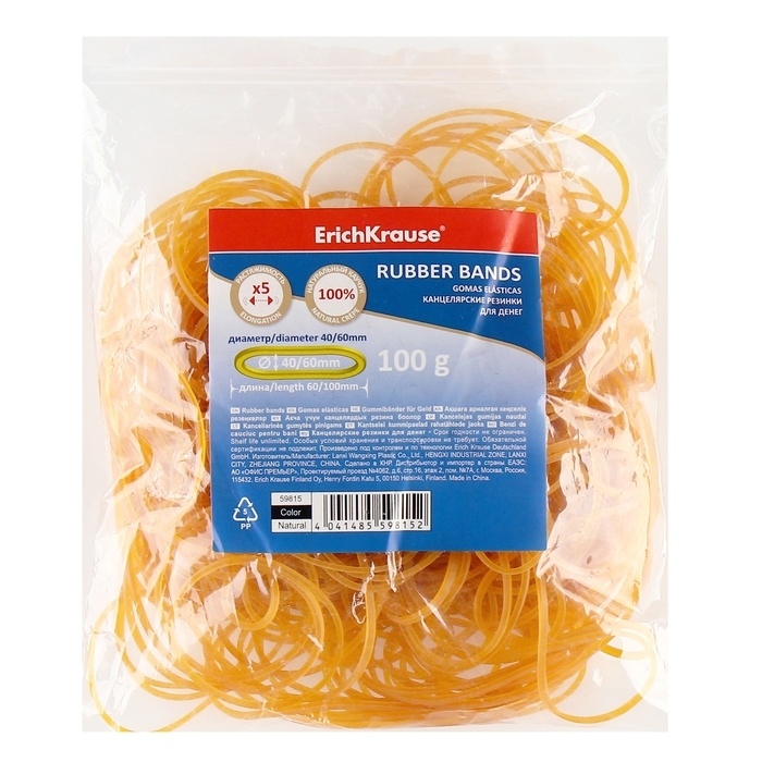 Банковская резинка, 100 г, ErichKrause, диаметр 40/60 мм, длина 60/100мм, 100% каучук, пакет, натуральный цвет