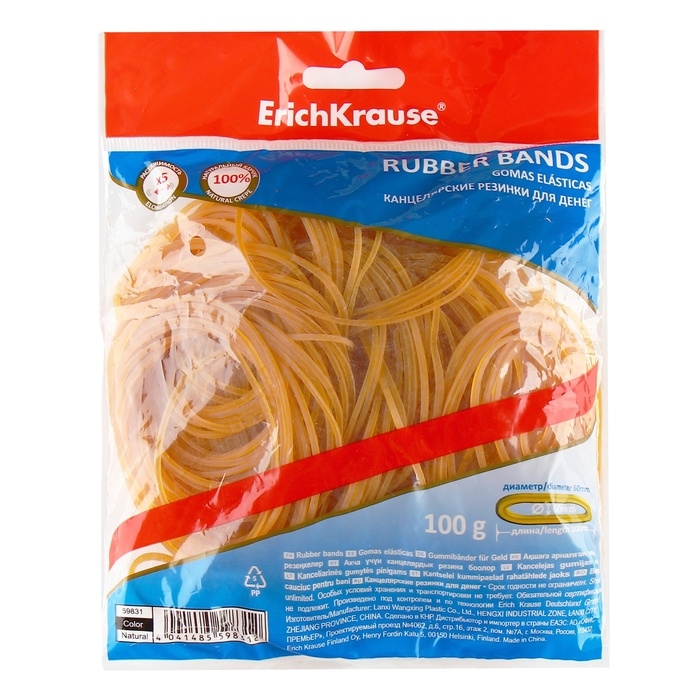Банковская резинка, 100 г, ErichKrause, диаметр 60 мм, длина 100 мм, 100% каучук, пакет с европодвесом, натуральный цвет