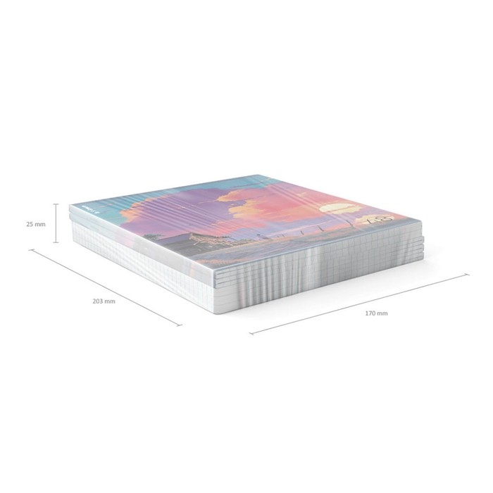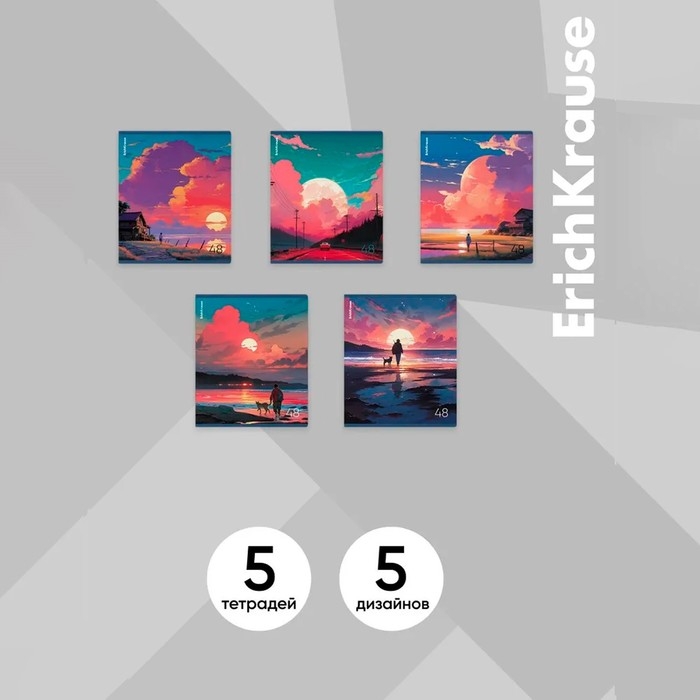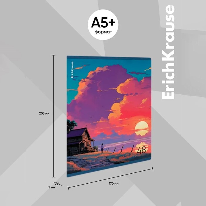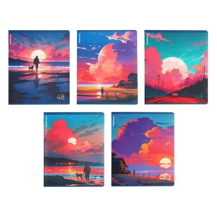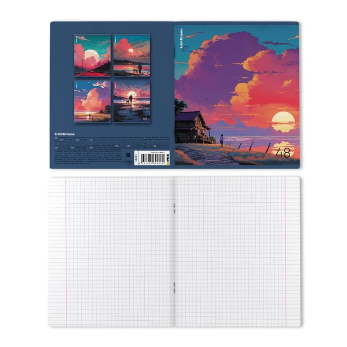 Тетрадь общая ученическая формата А5+ (170х203 мм). Обложка из высококачественного мелованного картона плотностью 190 г/м2. Отделка - глянцевая ламинация. В блоке 48 листов в клетку с полями. Бумага офсетная плотностью 60 г/м2. Цвет линовки - синий. Скругленные уголки обложки и блока. Тип скрепления - скоба. Тетради разного дизайна упакованы в термоусадочную пленку по 5 штук.