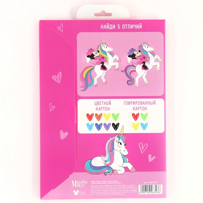 Картон цветной гофрированный, А4, 12 листов, 12 цветов, немелованный, двусторонний, в папке, 230 г/м², Минни Маус и Единорог