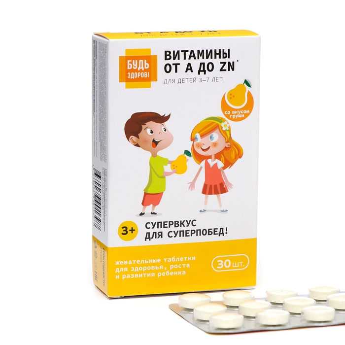 Витаминно-минеральный комплекс "Будь Здоров!" от А до Цинка для детей вкус груши - это препарат, который содержит комплекс витаминов и минералов, необходимых для поддержания здоровья и развития детей. Он упакован в удобные таблетки, всего в упаковке 30 штук.