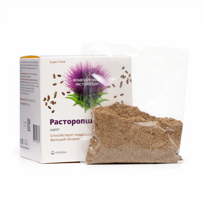 Расторопши шрот содержит природные биологически активные компоненты флаволигнаны, способствующие защите и восстановлению клеток печени, выведению шлаков и токсинов.