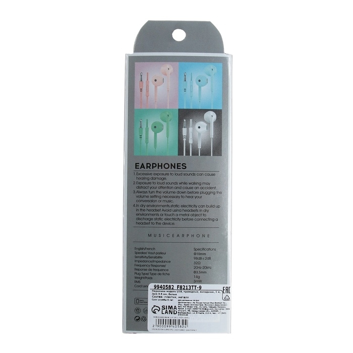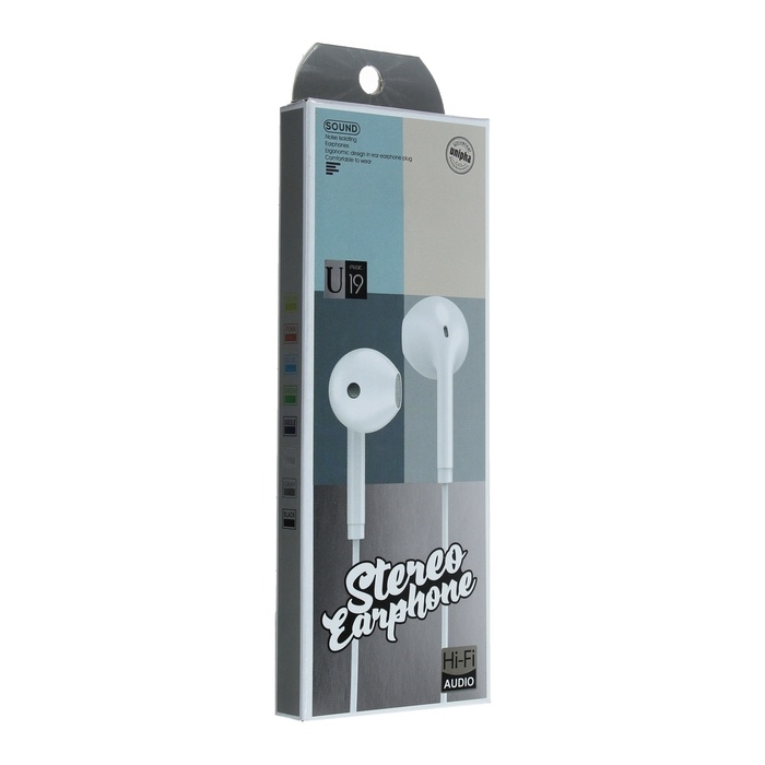 Наушники U19, проводные, вкладыши, 1 м, Jack 3.5 мм, белые