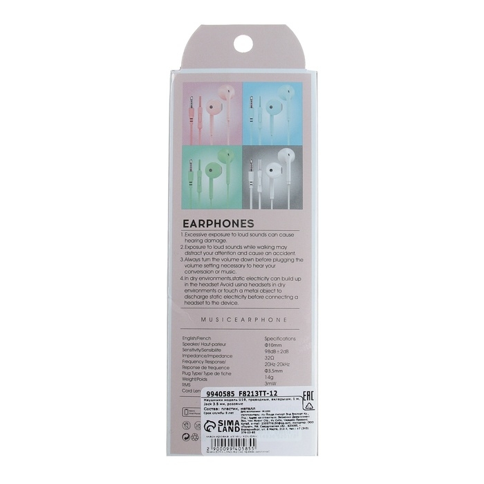 Наушники U19, проводные, вкладыши, 1 м, Jack 3.5 мм, розовые