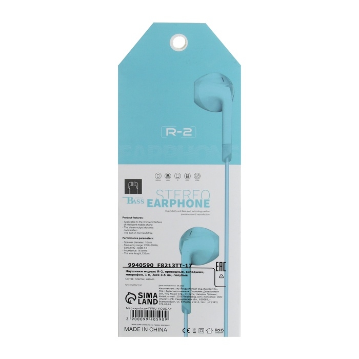 Наушники R-2, проводные, вкладыши, микрофон, 1 м, Jack 3.5 мм, голубые