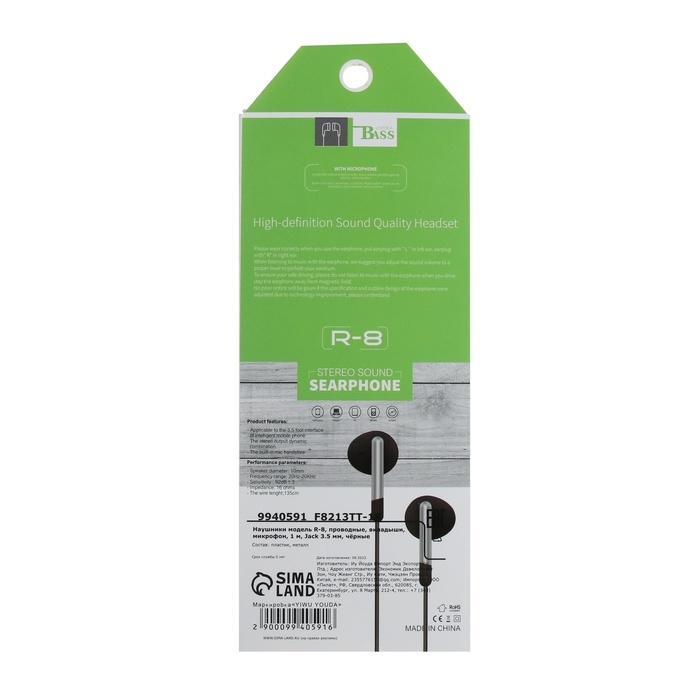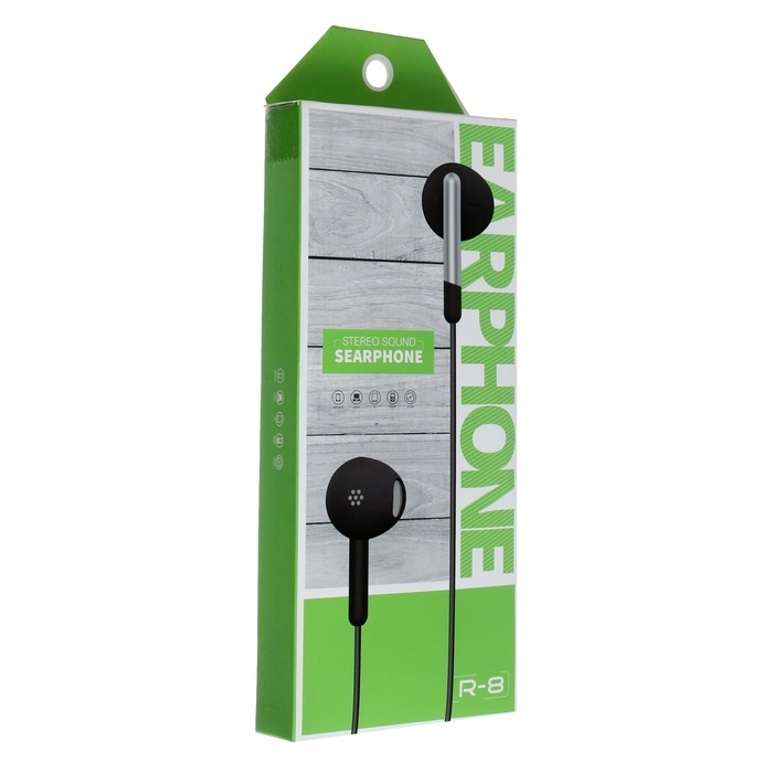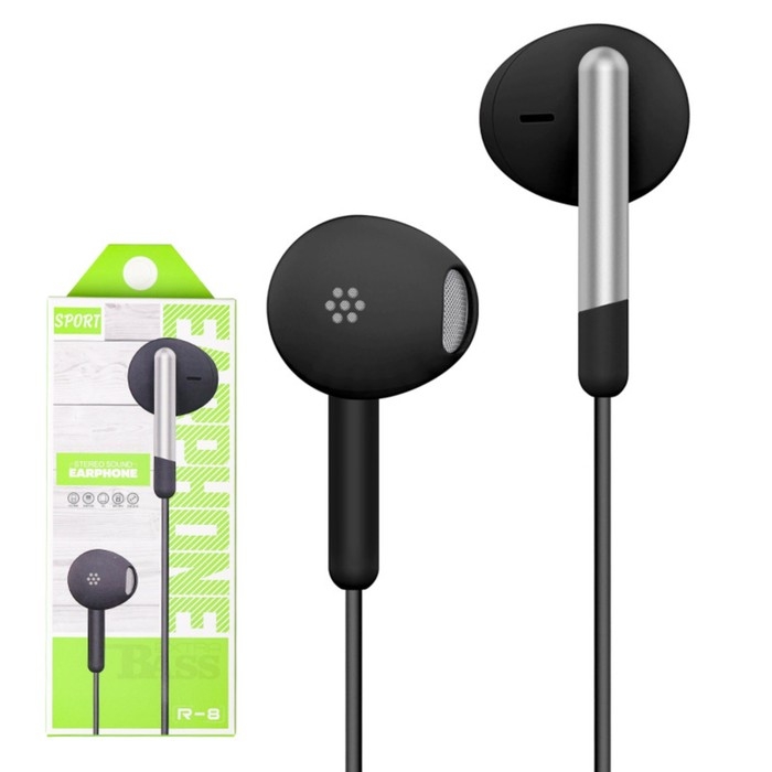 Наушники R-8, проводные, вкладыши, микрофон, 1 м, Jack 3.5 мм, чёрные