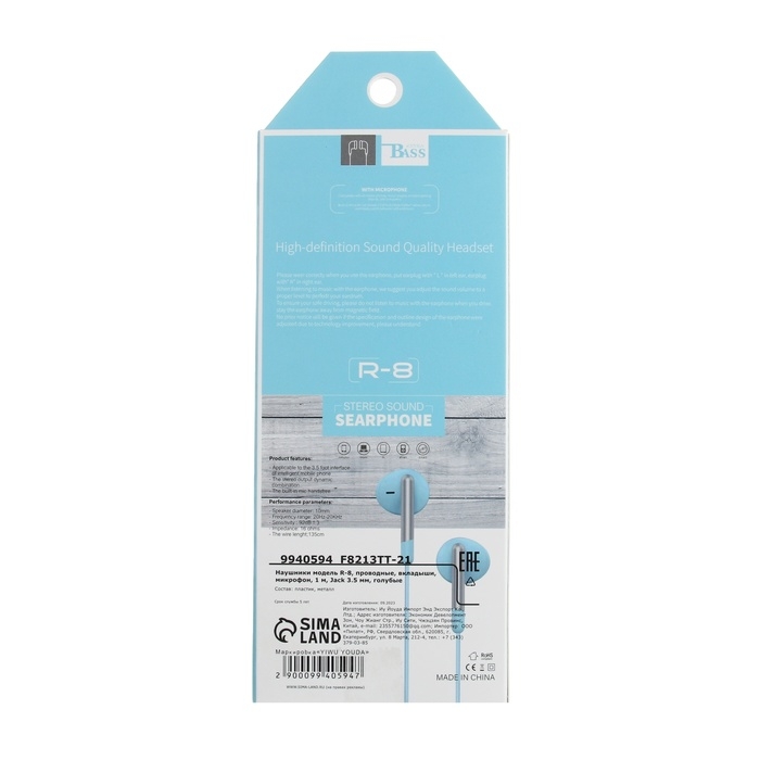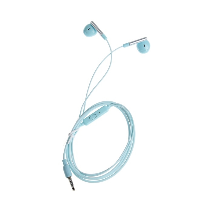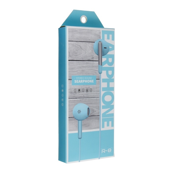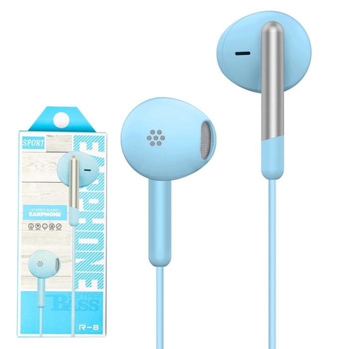 Наушники R-8, проводные, вкладыши, микрофон, 1 м, Jack 3.5 мм, голубые