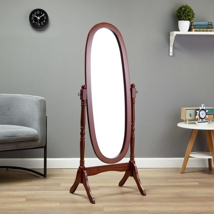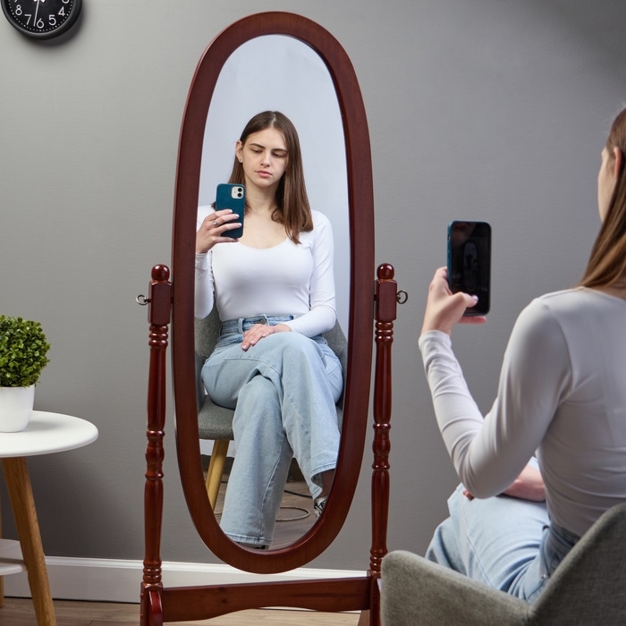 Дизайн: Напольное зеркало впечатляет своей овальной формой и стильным цветом, придавая интерьеру изысканный вид.