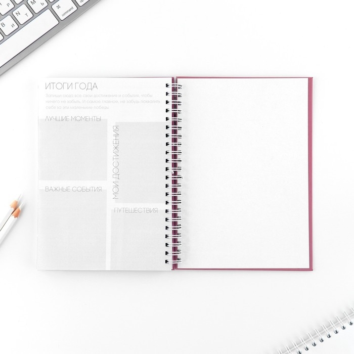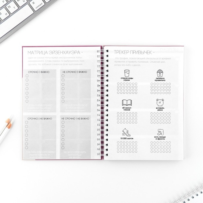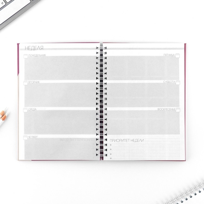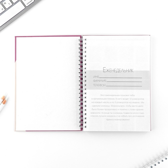 Этот еженедельник поможет тебе в организации планов. Он состоит из 12 разворотов на каждый месяц и 5 разворотов на неделю.
