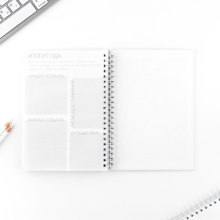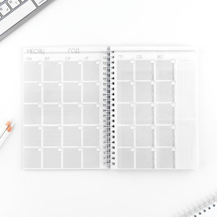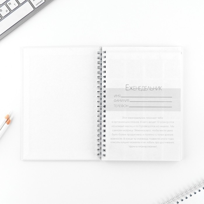 Этот еженедельник поможет тебе в организации планов. Он состоит из 12 разворотов на каждый месяц и 5 разворотов на неделю.