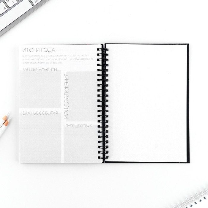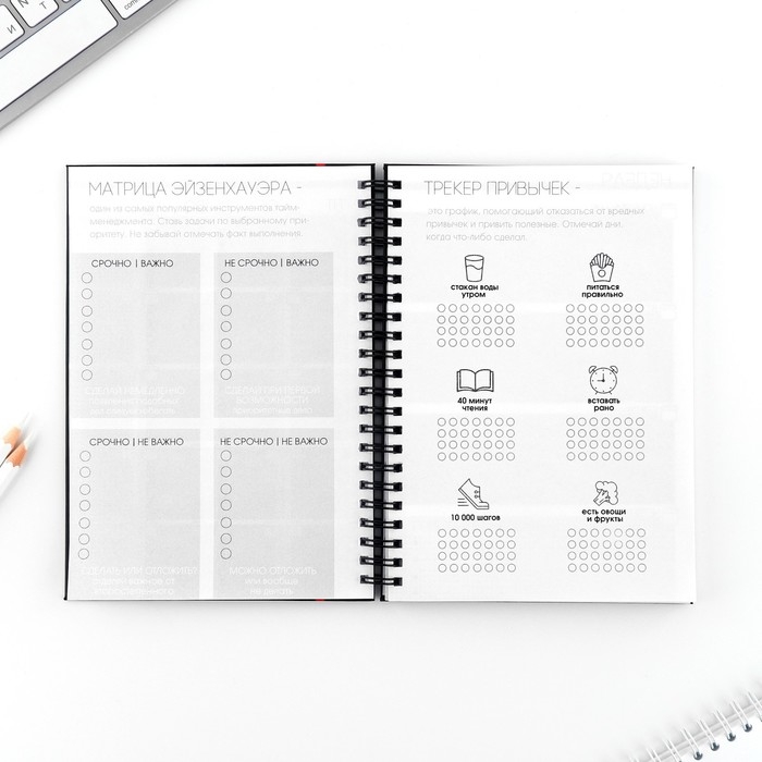 Этот еженедельник поможет тебе в организации планов. Он состоит из 12 разворотов на каждый месяц и 5 разворотов на неделю.