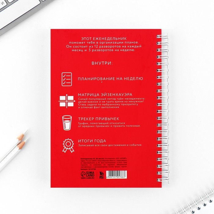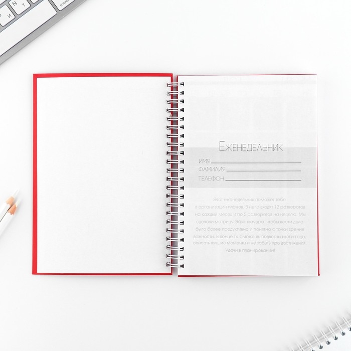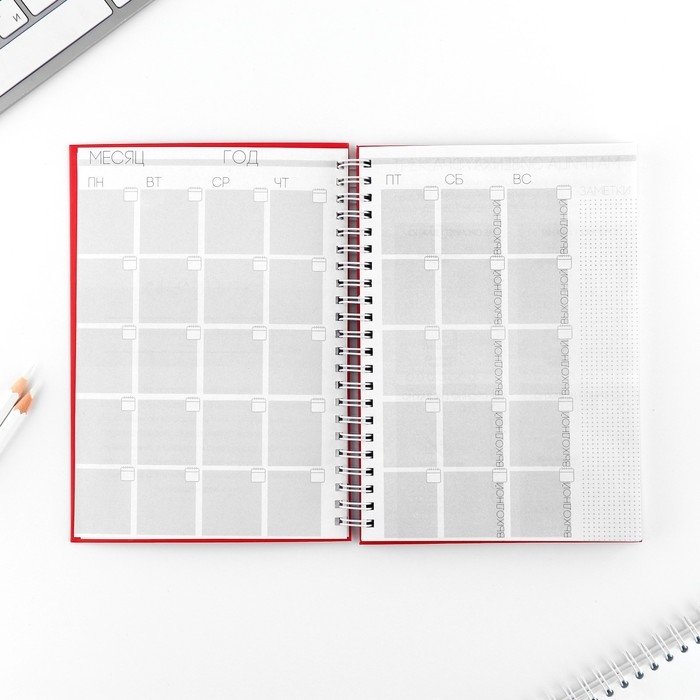 Этот еженедельник поможет тебе в организации планов. Он состоит из 12 разворотов на каждый месяц и 5 разворотов на неделю.