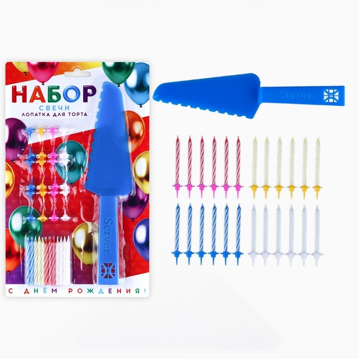 Свечи для торта в наборе с лопаткой для торта «С Днём Рождения», синяя лопатка, 17 х 27,7 см.
