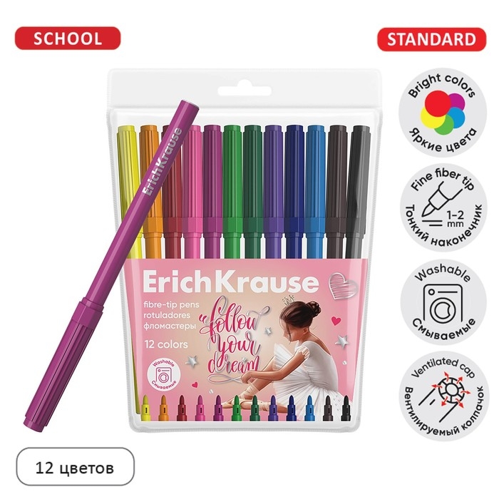 Фломастеры 12 цветов ErichKrause "Basic", на водной основ, вентилируемый колпачок