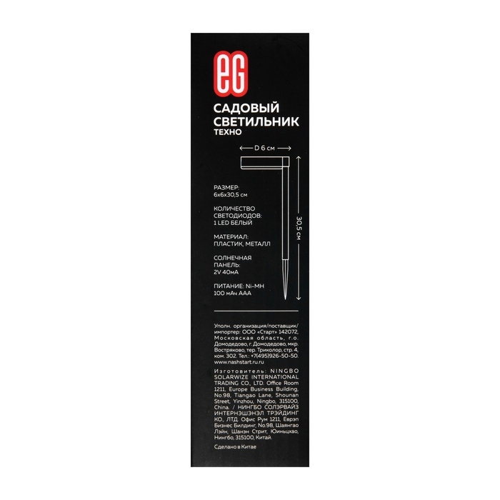 Светильник на солнечной батарее "Еврогарант", "Техно" 6x30.5 см, IP44, 1 LED, БЕЛЫЙ